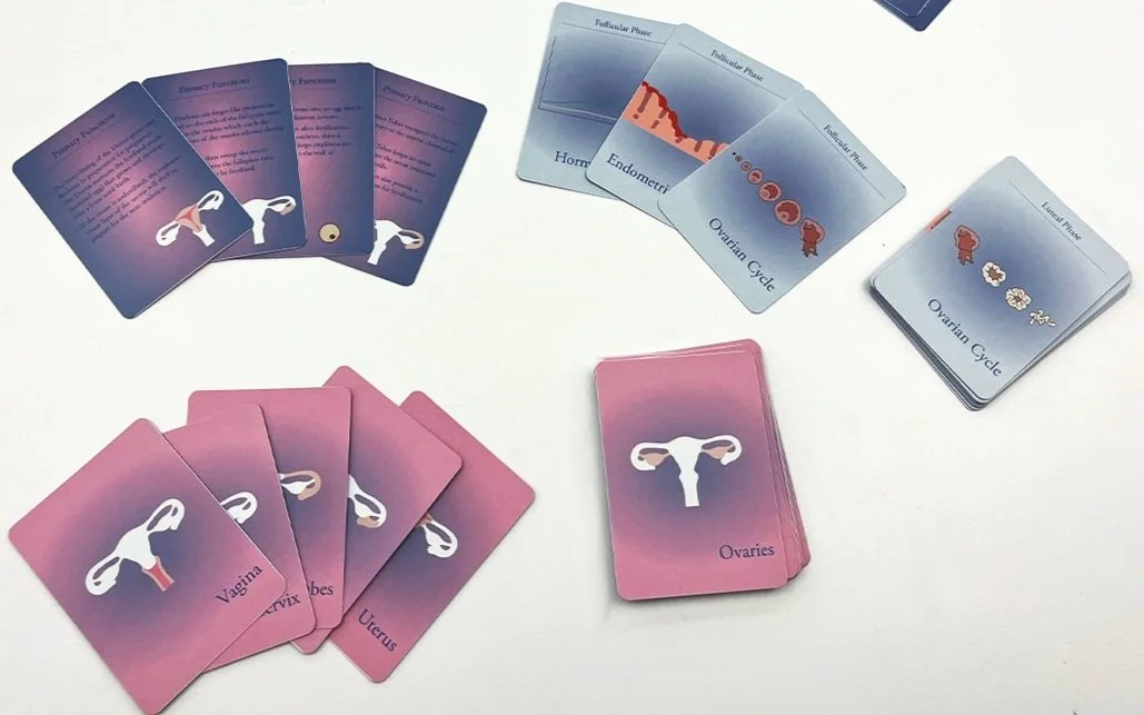 The deck of cards covers various phases of the menstrual cycle, such as the follicular and luteal phases, with corresponding puzzle pieces. This setup allows users to explore advanced aspects of the menstrual cycle, including the ovarian cycle, hormone level changes, and the transformation of the endometrium layer.